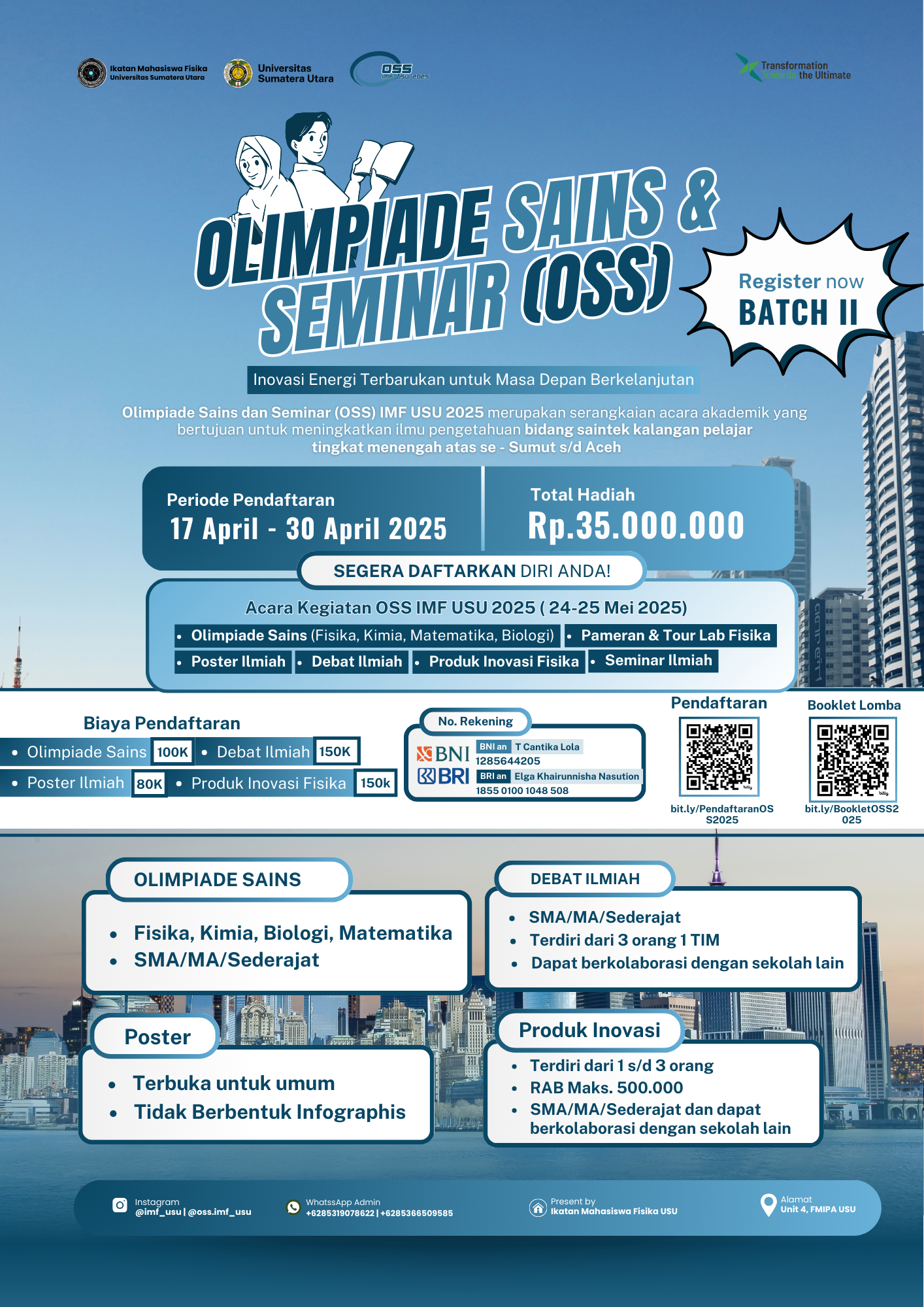 Olimpiade Sains dan Seminar (OSS) 2025 merupakan serangkaian acara akademik yang bertujuan untuk meningkatkan ilmu pengetahuan bidang saintek kalangan pelajar tingkat menengah atas se-Indonesia.